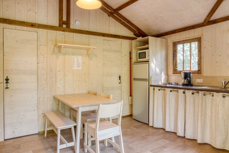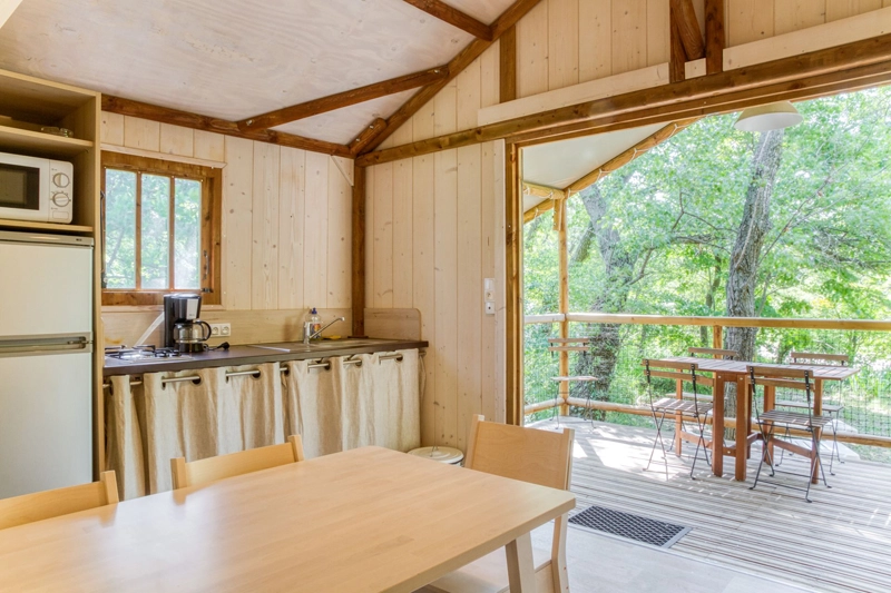 lodge proposée par Les Rives de l'Aygues, camping familial avec piscine en Drôme provençale. Il s'agit d'une charmante cabane en bois sur pilotis d'une superficie de 27 m², nichée dans un espace ombragé de plus de 200 m², capable d'accueillir jusqu'à 5 personnes. La lodge dispose en effet de deux chambres, une avec un lit double, la seconde avec trois lits simples, dont deux superposés. Ce logement présente un coin cuisine équipé et une salle de bains avec douche. Les WC sont séparés. Vous bénéficiez aussi d'une charmante terrasse en bois couverte, idéale pour prendre le petit déjeuner dans un cadre verdoyant.